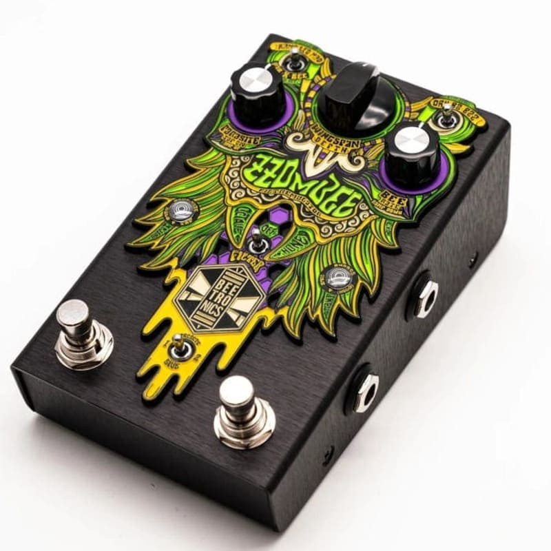 I suoni che si trovano nello Zzombe sono davvero unici e richiederebbero un rig super complesso per essere ricreati. Questo perché il segnale dello strumento può passare attraverso 4 stadi di gain (da dry a fuzz) e viene sdoppiato creando un percorso parallelo verso un octaver monofonico, nel puro stile Beetronics. Il filtro può essere attivato sia sul segnale originale che sull’octaver in modo indipendente. Ci sono tre modalità di Modulazione Filtro che possono creare effetti in stile Wah (e ti verrà voglia di lasciare a casa il tuo vecchio e grosso pedale wah), dolci ondate di LFO e oltre 65 mila pattern random creati per essere musicali e sempre a tempo. Ci sono inoltre tre modalità di Modulazione in Ampiezza che possono darti un tremolo tradizionale, swell di volume e l’innovativo cross-tremolo.